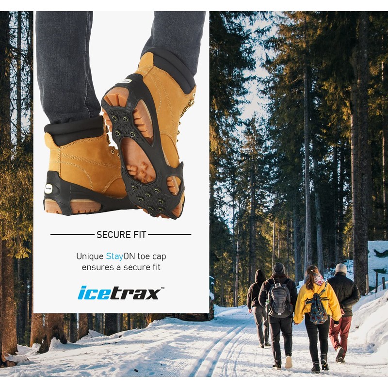 - SECURE FIT - Ergonomic design with StayON toe cap ensures a snug fit of most types of footwear and helps to prevent the ice cleats from falling off or moving around while in use. Superior fitting ice grippers ensures extra stability and safety for the user by securely staying in position on your shoes and boots.