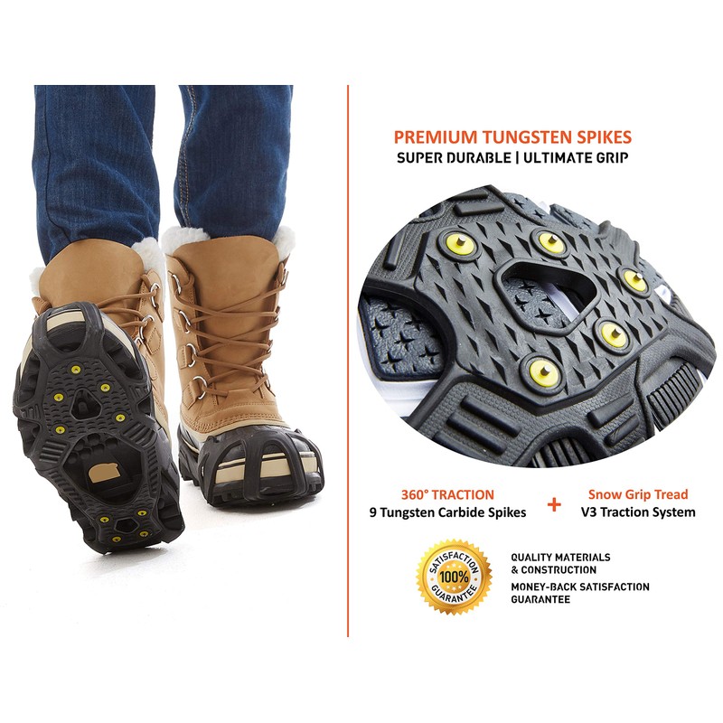 - TUNGSTEN SPIKES – Prevent slips and falls this winter with our new and improved ICETRAX V3 Tungsten ice cleats. Designed in Canada for harsh winter conditions, these ice grippers feature 9 strategically placed Tungsten Carbide ice cleat crampons combined with our proprietary snow tread traction system for maximum traction on ice and snow. ICETRAX ice cleats help you to walk, run and work more confidently in slippery winter conditions without worrying about slipping.
