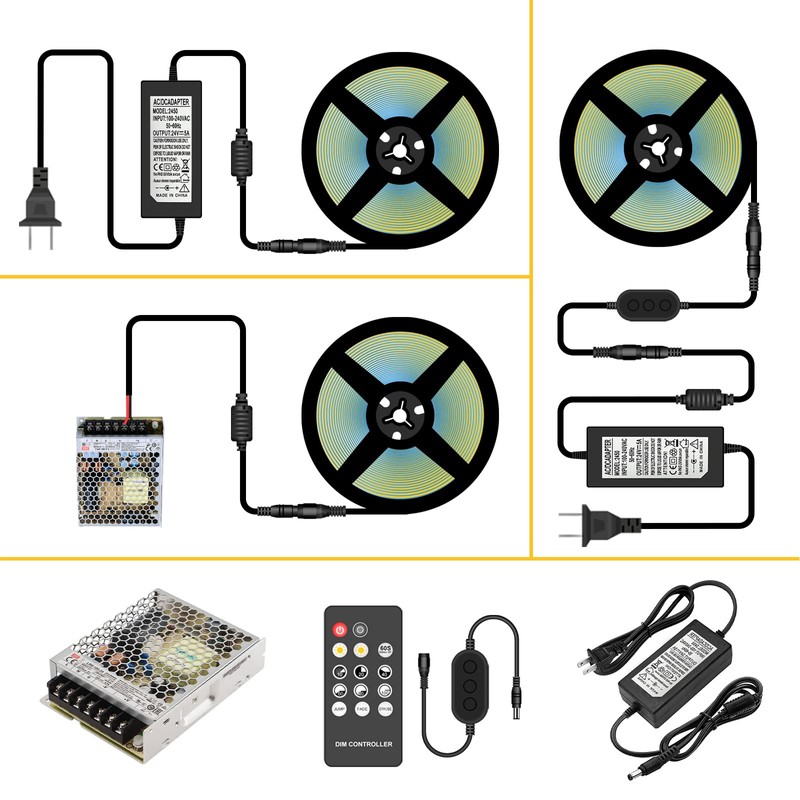 - Package & Parameters: The package includes one 16.4FT FCOB LED strip (power supply and controller not included), one two-end wire connector, and 5 LED strip fixed clips. The strip offers 3000K: 950-1050LM/W, 4000K: 1050-1150LM/W, 6000K: 1150-1250LM/W, CRI 90, 8mm Width, 9.6W/m. For accurate power calculation, please consider voltage drop.(Not including power supply!)
