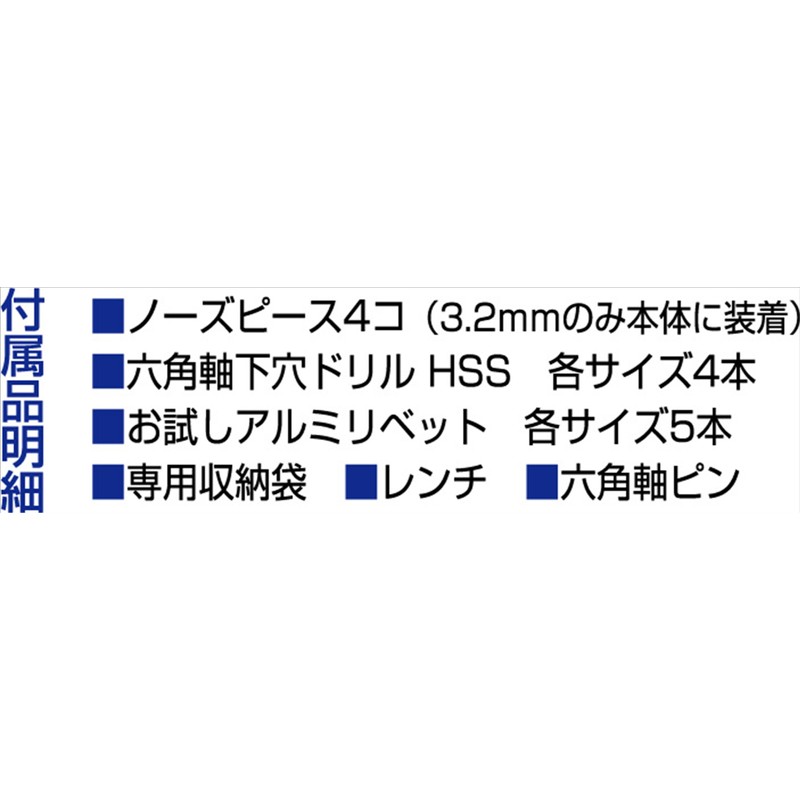 • Accessories: Nose piece x 4 (for 0.1 inch (3.2 mm) only), Hexagonal shank drill HSS 5 each size, 5 trial aluminum trivet sizes, dedicated storage bag, wrench, hexagonal shaft pins