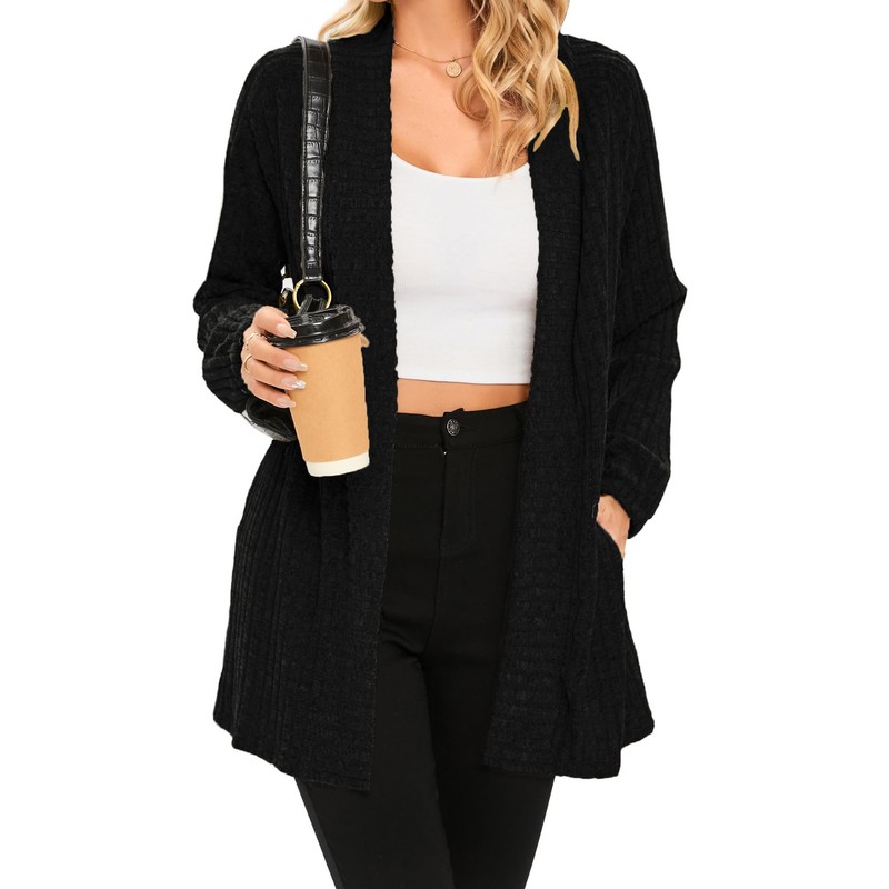 iChunhua Lightweight Soft Long Length Open Front Black Cardigans for Ladies UK with Pockets (Black, Medium)