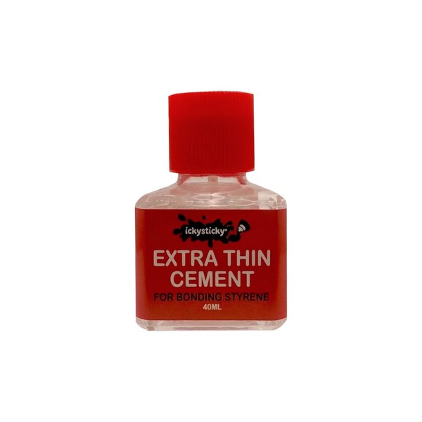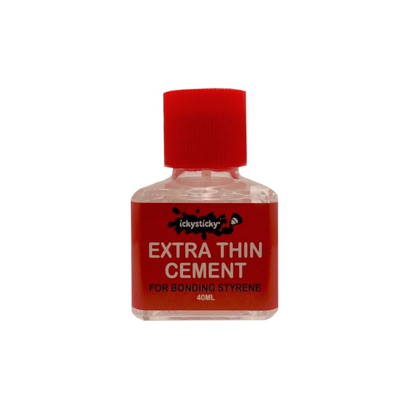 - ICKYSTICKY EXTRA THIN CEMENT is a solvent based adhesive formulated to bond polystyrene plastic, commonly used in making plastic model kits.