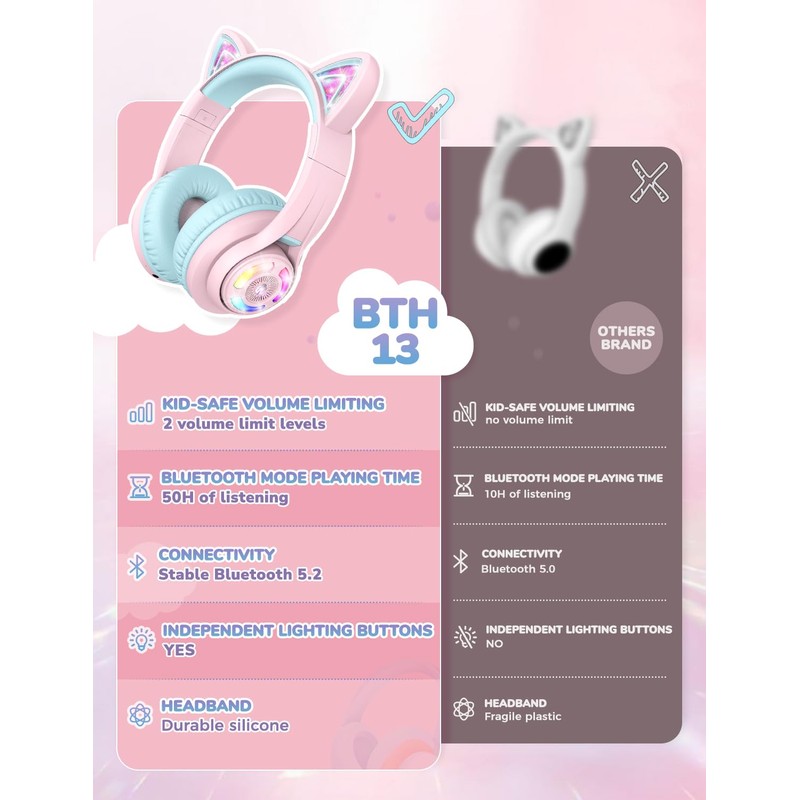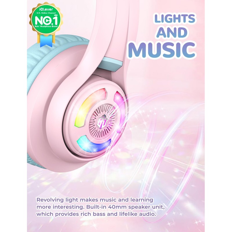 - [Cute & Stylish]: It's the evolution of kids headphones--great sound quality and a cute, fun, kid-friendly design. Your little ones will love the iClever cat ear headphones, whose RGB LED lights are controlled by one independent button. When pressed in Bluetooth mode, it will turn off the lights to extend use time.