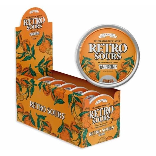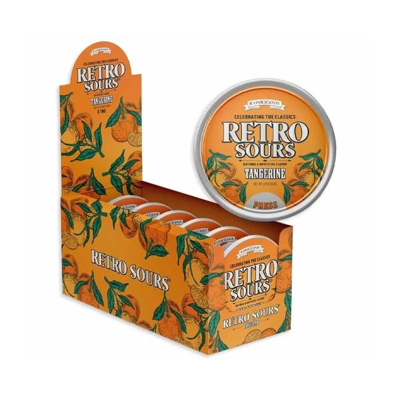 Iconic Candy Retro Sours Display Sealed Box of 8 Tins Tangerine Flavor