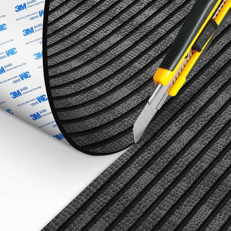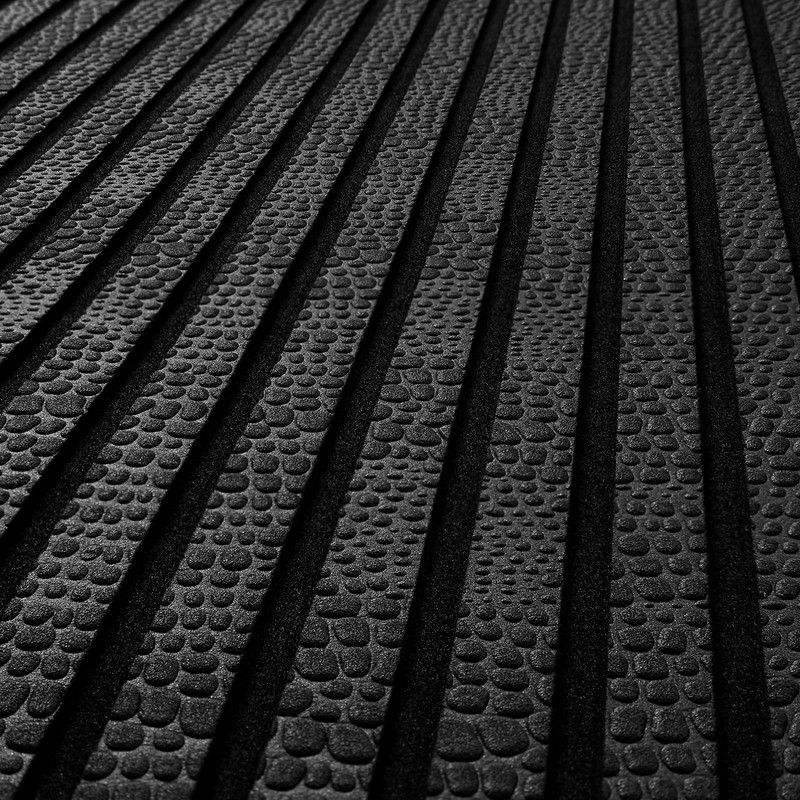 This high-quality EVA foam boat flooring in a sleek black color and with embossed pebble texture, featuring a 6mm thickness for superior cushioning and grip. The V-groove design ensures quick and efficient water drainage, while the strong 3M adhesive backing provides a secure and long-lasting hold.