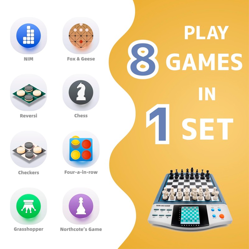 - The electronic chess games include fun levels for beginners, 16 chess modes, and 30 skill levels to choose from. It also features a talking chess academy that acts as a chess tutor, warning of threats to your pieces and announcing legal moves.