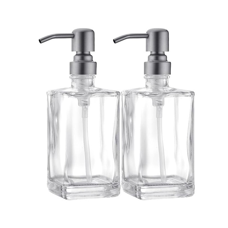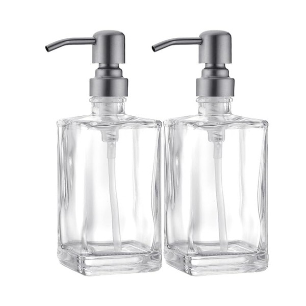 ICREEH Glass Soap Dispenser Set, Stainless Steel Pump & Clear Square Glass Soap Dispenser Bottle, 2X 13.5oz Refillable Hand Soap Dispenser for Kitchen & Bathroom, Brushed Nickel