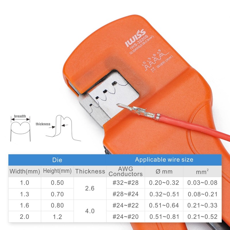 - IWS-3220S ratcheting wire crimping tool is designed to crimp micro connectors AWG 32-20.