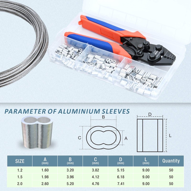 - ◆151PCS TOOL SET◆ CWR1522 wire rope crimper and 150pcs aluminum double sleeves for railing,decking, picture hanging