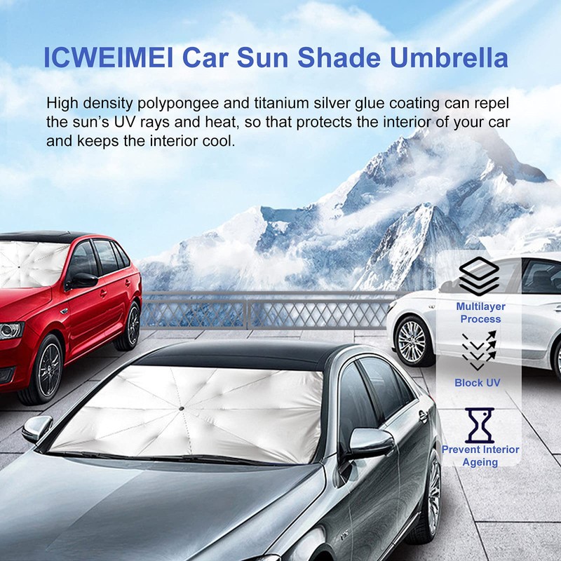 ICWEIMEI Parasol grande para automóvil, paraguas plegable para coche, parasol para parabrisas de coche, protege el vehículo del sol y el calor, mantiene tu coche fresco y el equipo sin daños, fácil de usar y almacenar