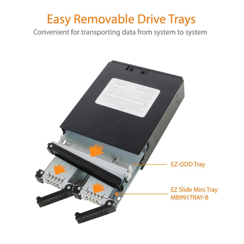 - Fits 2 x 2.5" SATA/SAS hard drive or SSD & 1 x slim optical disk drive (ODD).
