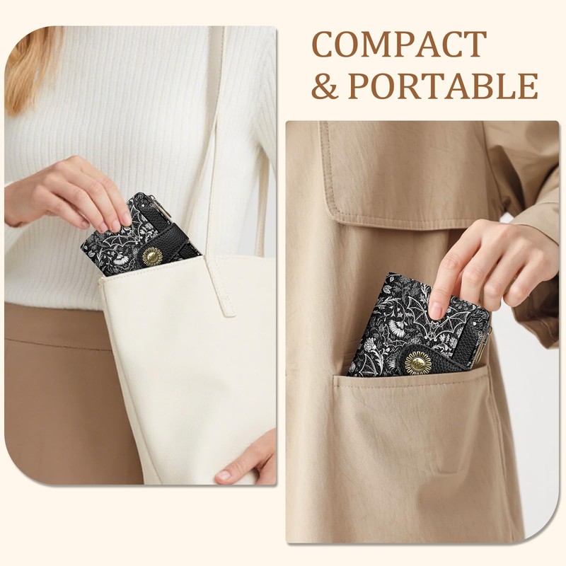 - Stylish Upgrade: Upgrade from simple and plain designs! Our small wallet for women features bats with outstretched wings, interspersed among an array of floral and leaf motifs. All these elements are set against a dark black background, creating a mysterious and vintage visual effect