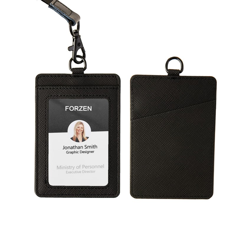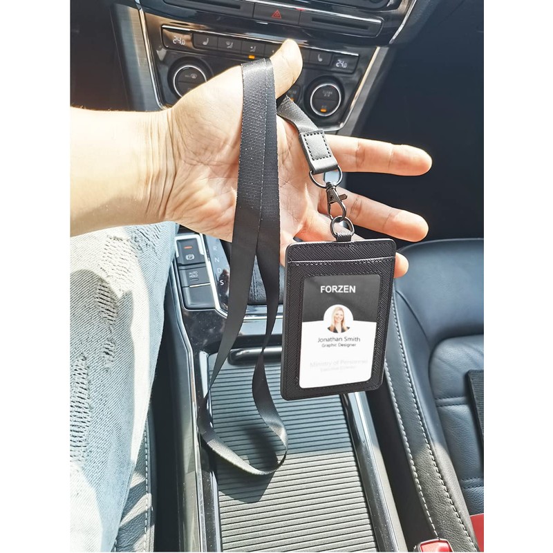 ID Card Holder, Vertical Leather ID Card Holder, Transparent ID Window with Lanyard for Men and Women, Teacher, Nurse, Student (Black-A)