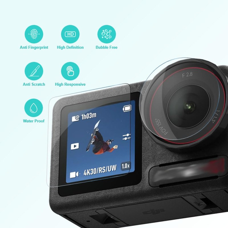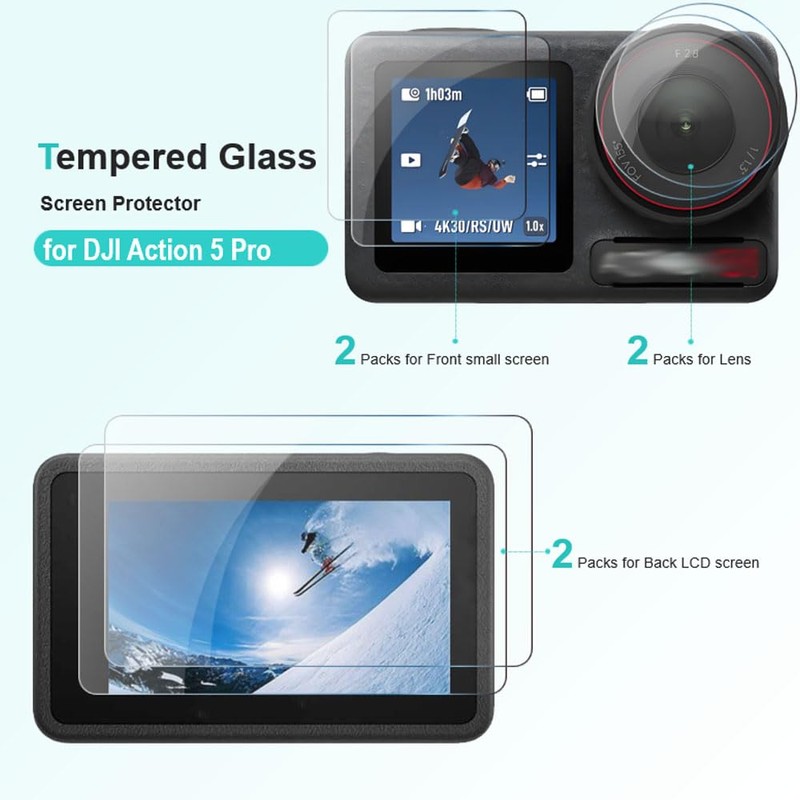 - ✅ Only compatible with DJI OSMO Action 5 Pro cameras, not suitable for other cameras. Includes 2 x tempered glass screen protector, 2 x front protector and 2 x lens protector with the necessary items.