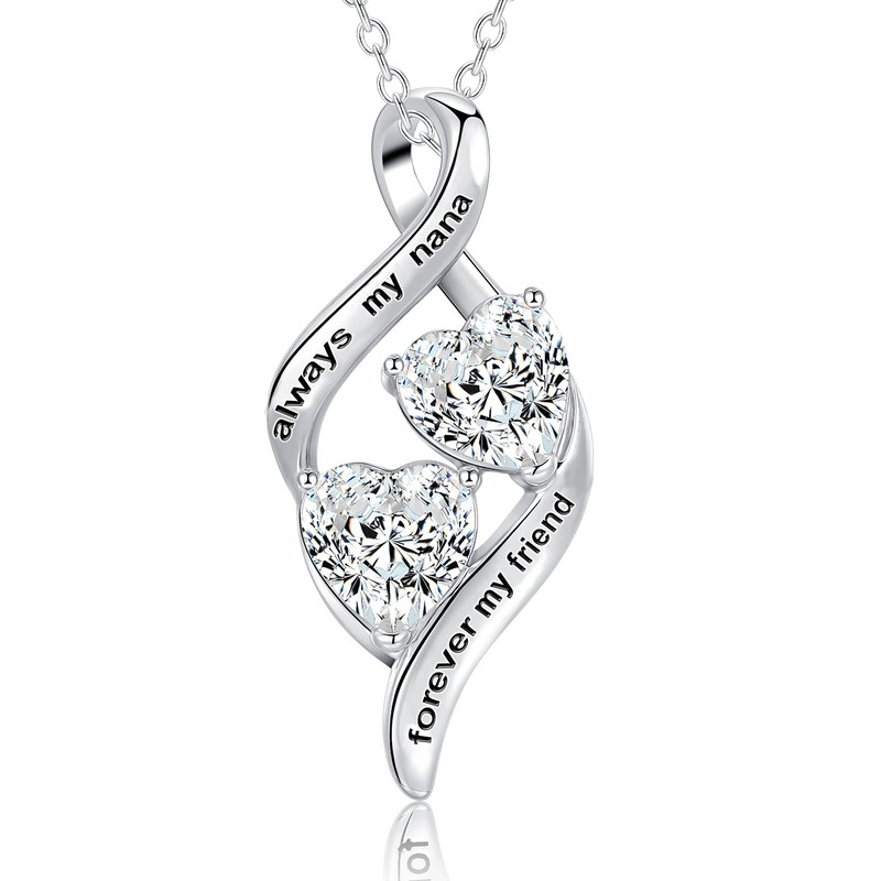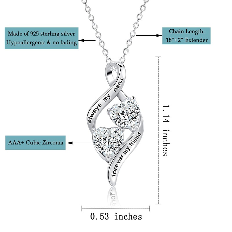 - Design Concept: Two shiny heart shaped cubic zirconia that represent the heart between grandma and grandchildren wrapped in a wing, with laser engraved words "Always my nana, forever my friend", which shows to your nana that wherever life takes her, you and your nana will always stay heart to heart