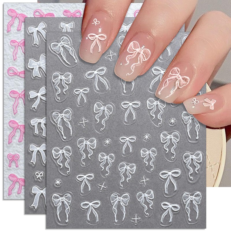 IDDFEVE Bow Nail Art Stickers - White Pink Bow Self-Adhesive Nail Decals for DIY Valentines Day Manicure (3 Sheets)