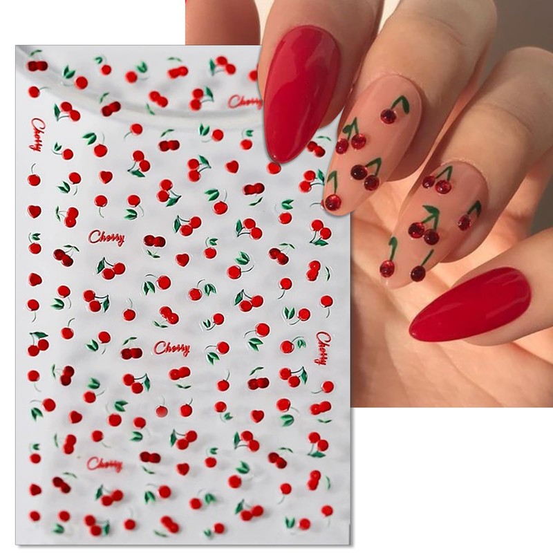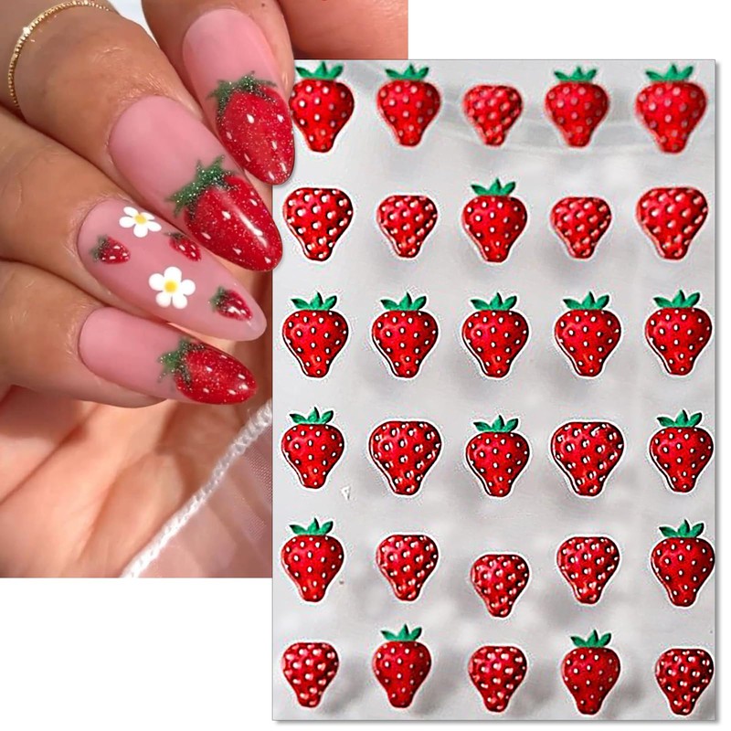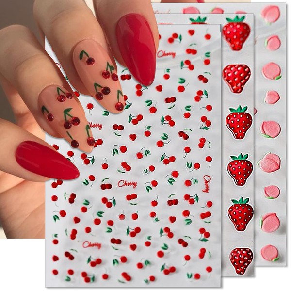 IDDFEVE Embossed Fruit Nail Art Stickers - 5D Cherry Strawberry and Peach Design Self-Adhesive Realistic 3D Effect Nail Decals for Little Girls Kids DIY Summer Manicure (3 Sheets)
