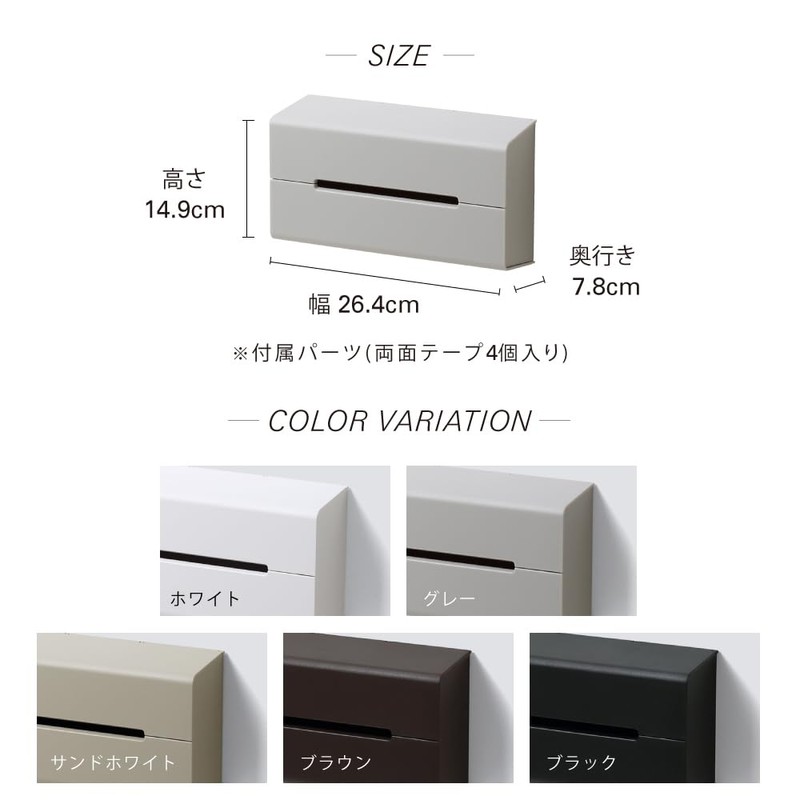 - Material: ABS resin (main unit), ABS resin, double-sided tape (4 included parts) ※Surface matte finish