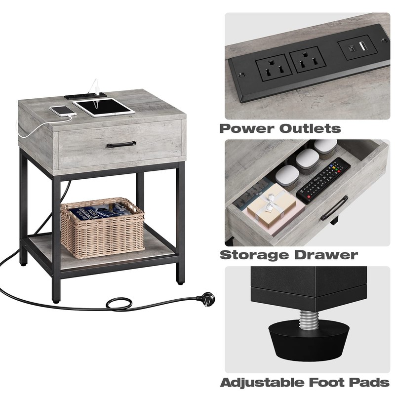 IDEALHOUSE 2024 New Nightstand with Charging Station - Rustic Grey Side Table with Drawers and Open Shelf - Bedside Table with USB Ports and Outlets