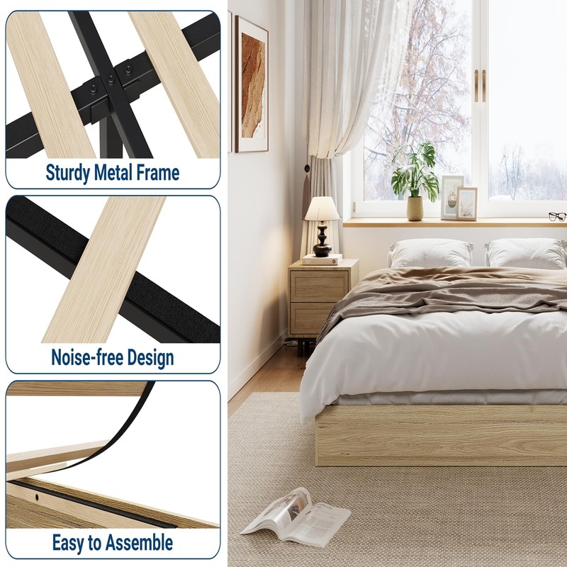 • 【Sturdy & Durable Structure】This wooden bed frame features sturdy cross beams and support slats, providing ample support so that the mattress can be placed directly on top without the need for an additional box spring. This design not only simplifies the setup of the bed but also enhances the durability and stability of the frame.