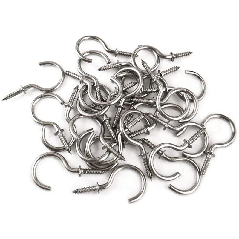 - Indoor and Outdoor Use:304 stainless steel screw cup hooks they are very versatile,hang coffee mugs cup, organizing your wardrobe Belts, hats, scarves,jewelry necklaces, kitchen utensils, towels, curtains , brooms ,plants,keys,necklaces, wind chimes,birdcage and more. These heavy duty hooks not rust, not corrosion, perfect for outdoors. Hanging flower baskets, wind chimes and lanterns, chirstmas festival lights,Camping tents etc.
