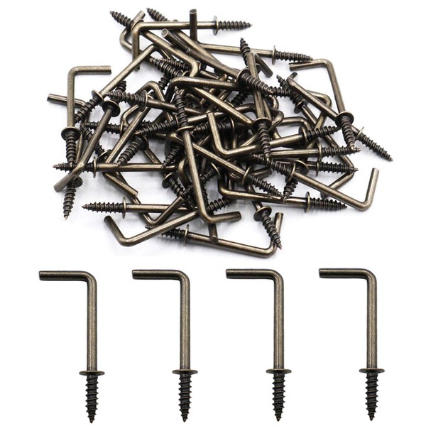 IDEALSV Antique Brass 1-1/4 Inch 1 Shape Screw Hooks L Shape Hooks Vintage Bronze 7 Shape Right Angle Medal Hooks (50 Pack)