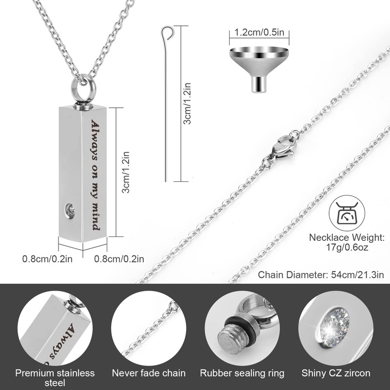 - 【Thoughtful Design】These cremation necklaces are in a minimalist style and vertical cube shapes design, each ashes necklace is engraved with warm words: "Always on my mind", "In loving memory", "Forever loved", you can store the ashes, a lock of hair/fur, or some special keepsake of your love one, it will help you to remember the loved ones forever and keep your loved one close to your heart at all times when you wearing it.