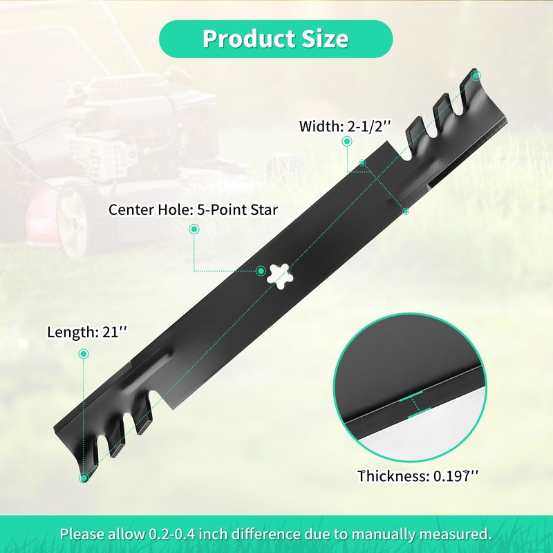 - Specification: Package includes 2 x 138971 mulching blade. Length: 21", Width: 2-1/2", Thickness: 0.197", Center Hole: 5-point star. Before ordering, please make sure the lawn mower blade matches your mower.