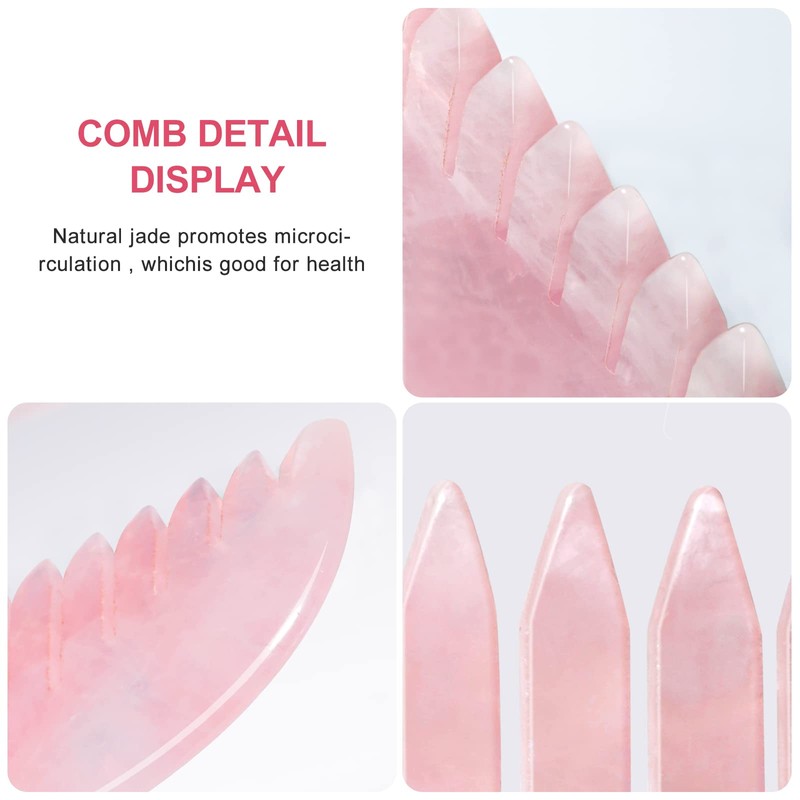 • Gua sha and massage: rare rose quartz contains many trace elements, the serrated side of the jade stone comb can massage the head and the other side can use gua sha (face, head, neck, back, hands and feet) which can promote blood circulation, help skin beauty and metabolism.