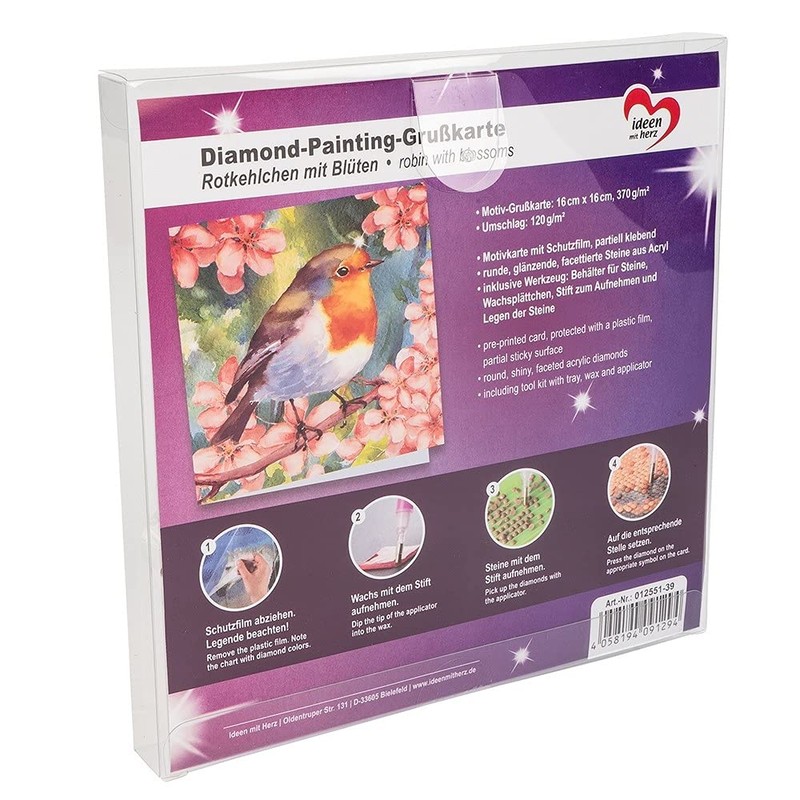 With this set you get everything you need to get started directly with the diamond painting. The high-quality printed card is self-adhesive in the area of the motif to be laid and can be directly covered with the elaborately faceted stones. The included tool is ideal for easy picking up and setting of the stones. This creates wonderfully sparkling greeting cards that are sure to be an eye-catcher everywhere.