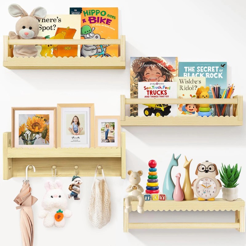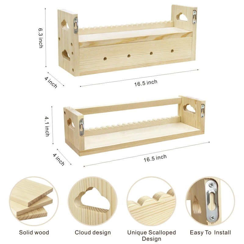 【Safe & Sturdy】The nursery bookshelves are made of natural pine wood material, which is different form others. They are sturdy and durable. Our floating shelves feature an advanced dual-guard rail design, providing double protection for kids.