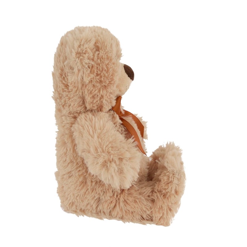 - The cuddly teddy with soft, beige fur and red-brown bow is a faithful companion for babies and children