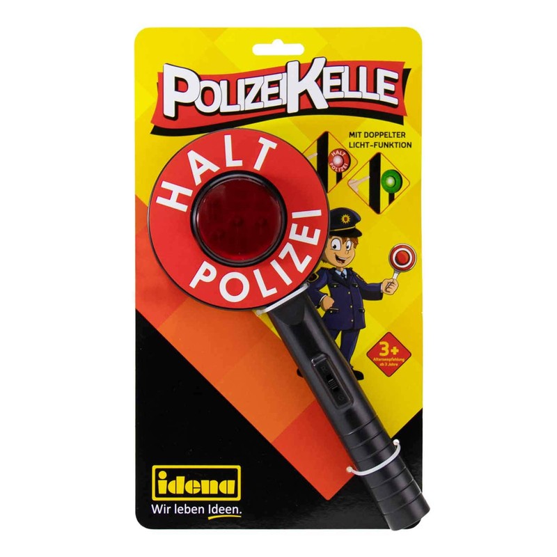 Mit der Polizeikelle von Idena können kleine Wachtmeister ihrem großen Idolen nacheifern. Die Kelle ist mit einer Lichtfunktion ausgestattet. Über einen Schalter kann man entweder rotes Licht für "Stoppen" oder grünes Licht für "Weiterfahrt" auswählen. Auf der roten Seite ist in großen Lettern "HALT POLIZEI" aufgedruckt. Die Polizeikelle ist ca. 24 x 10,5 x 3,5 cm groß und besteht aus robustem Kunststoff. Sie eignet sich wunderbar als Accessoire für Kostüme oder auch für Rollenspiele der Kinder. Dabei werden spielerisch soziale Kompetenzen gefördert und die Fantasie angeregt.
