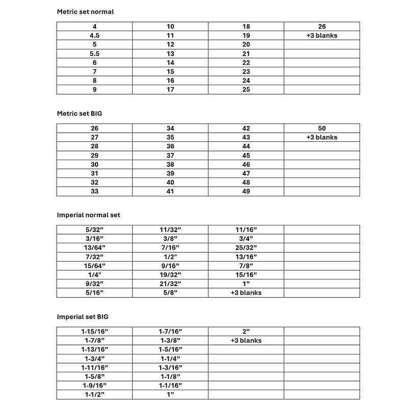 - Metric and SAE variants available in both standard and "BIG" size sets.