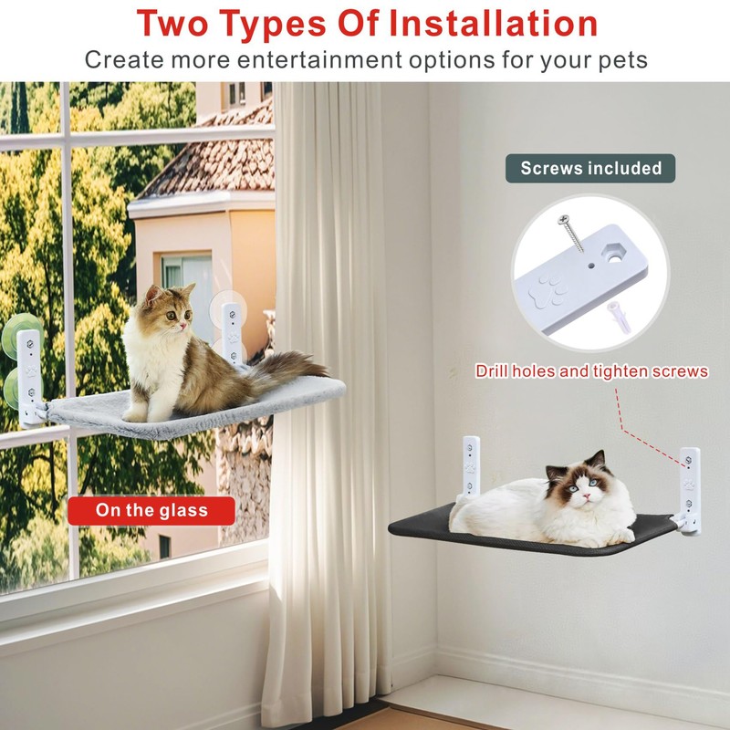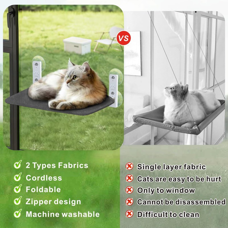 • 【Easy Installation and 360° Panoramic View】No tools or special skills are required for installation—simply attach the suction cups to any window in minutes. The sunken design caters to cats’ natural instincts to curl up, while the elevated perch provides a perfect spot for sunbathing, bird-watching, and enjoying a 360° view of the surroundings.