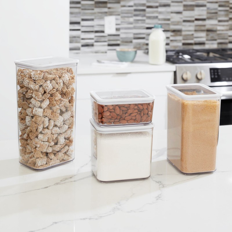 - AIRTIGHT SEAL: Thanks to the airtight seal between the cylinder and the clear window-style lid, the contents of each kitchen storage container stay fresh and dry.