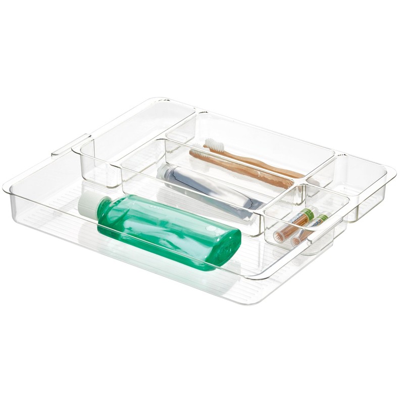- FUNCTIONAL DESIGN - This adjustable design slides out to create even more storage space; The clear construction brings a sleek and clutter-free look to any drawer while keeping contents inside easy to view and grab; Mix and match with other iDesign Drawer Organizers to create a custom solution inside any drawer throughout your home