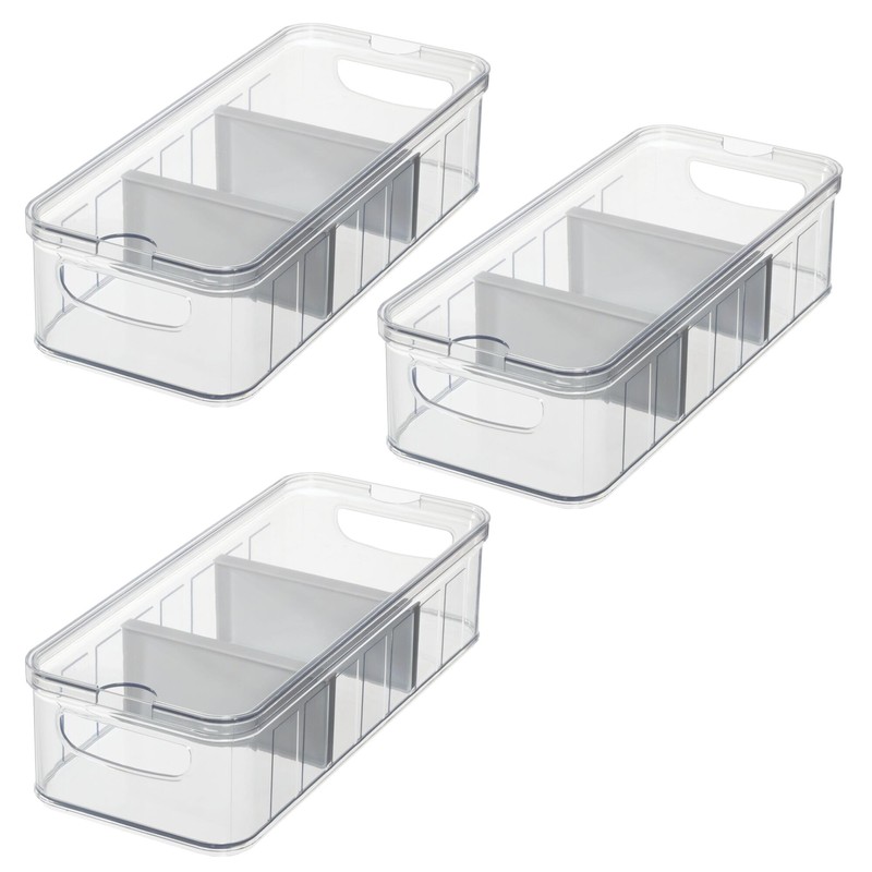 iDesign Large Fridge Organizer Bin with Removable Divider and Lid - Set of 3 - Clear/Gray