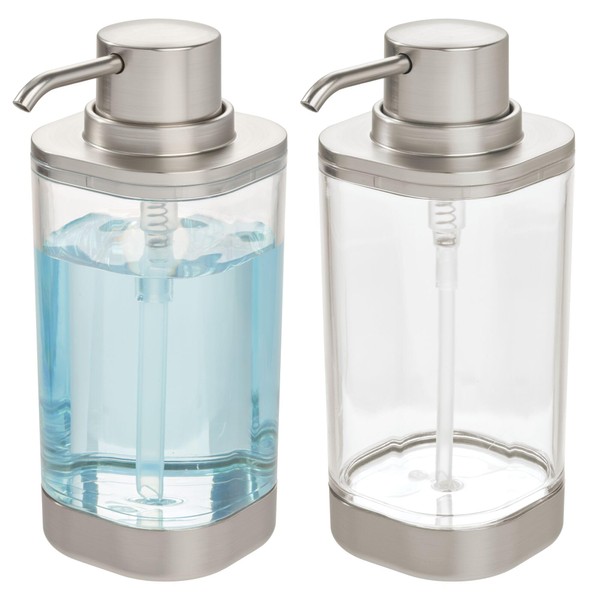 - REUSABLE SOAP DISPENSER - Upgrade your bathroom accessories with the iDesign Ilese Liquid Soap Pump; This soap dispenser displays a clear vessel that makes it easy to see when it's time to refill and a hand-press pump and base in a brushed nickel finish that's minimal in appearance; Set of 2