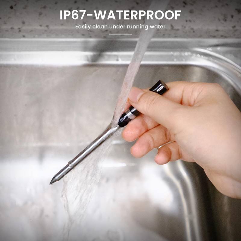 - [Fast charging]: The Hub plug in with a Type-C cable for uninterrupted use or opt for 2 x AAA batteries for mobility. Charging the probe for 5 minutes is enough to work for 3 hours. Charging for 2 hours can work for more than 48 hours. Especially suitable for overnight cooking. The IP67 waterproof design of the probe and a quick response time of 1-3 seconds enable quick cooking anytime, anywhere.
