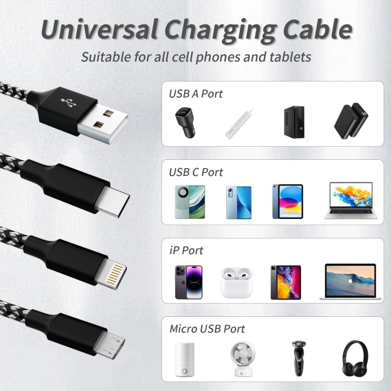- Prominent Compatibility: ●The Type C port: Compatible with type c supported devices including Android phones, iPhone 16/15 Series(Charging Only, doesn't support carplay function!!!). ●The Micro USB port: Most Android and Windows phones, tablets and many other devices( Charging Only).●The IP connector can be use for iphones . Wide compatibility makes this multi charger can be used as travel charger cables for multiple devices.