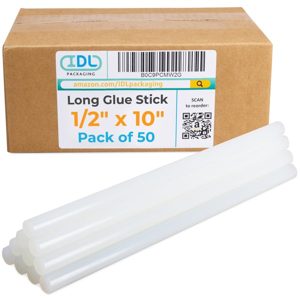 IDL Packaging 1/2" (0.43-inch) x 10" Variety-of-Surfaces Full-Size Hot Glue Sticks for Glue Guns, Clear (Pack of 50) - Superior Bonding Strength for Foam, Vinyl, Leather, Upholstery, Furniture