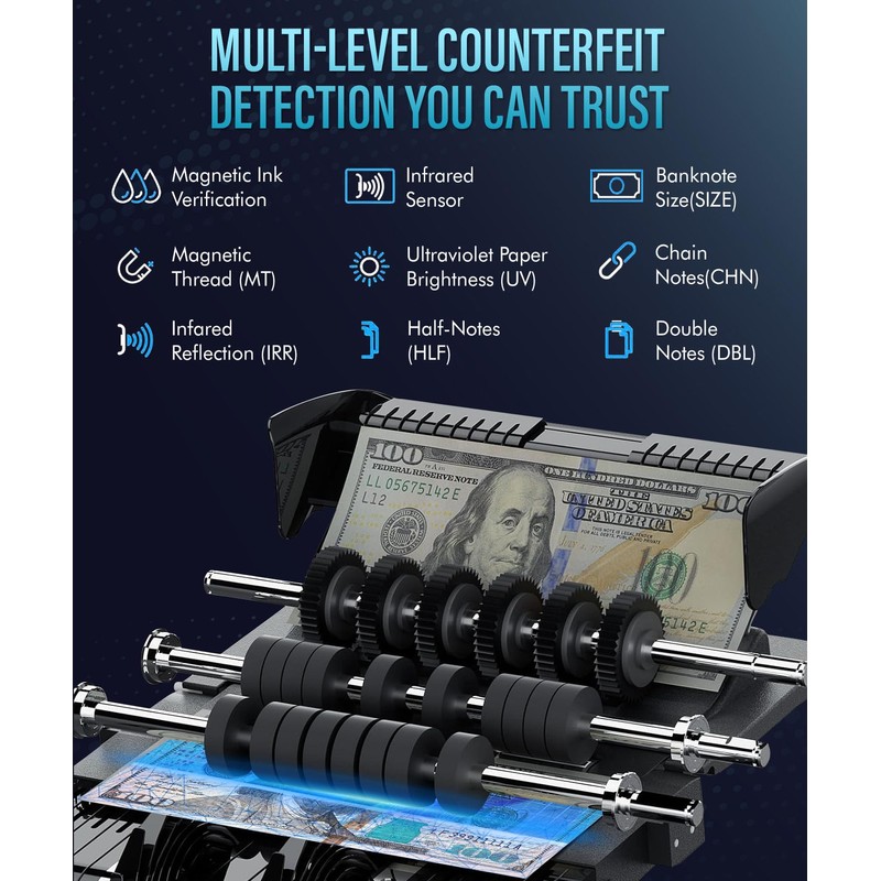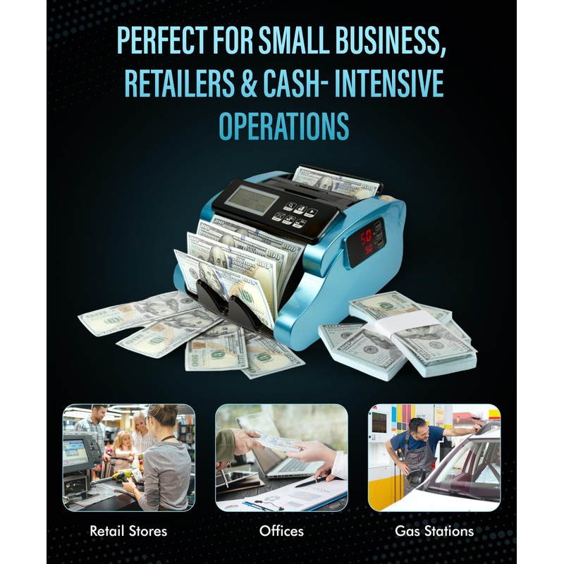 • ⭐ Detection: the money counting machine is equipped with precise security features to check whether passing bills are suspect counterfeit bills or genuine ones. Genuine notes consist of special security layers that can be checked by the BC-1100 money counter Magnetic, Ultraviolet, Infrared, for MG ink, UV paint, paper quality, and thickness match with the authentic US dollars. The BC-1100 is the best affordable bill counter choice for money handling needs.
