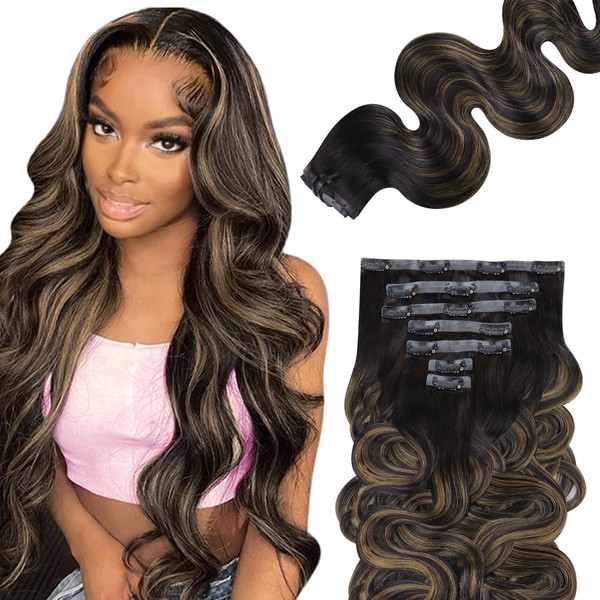 IDN BEAUTY Seamless Clip In Hair Extensions Human Hair, Body Wave 20 Inch 110g 7pcs, 1B/6/1B Balayage Natural Black to Chestnut Brown Remy Hair Seamless Clip Ins For Black Women PU Invisible Edge