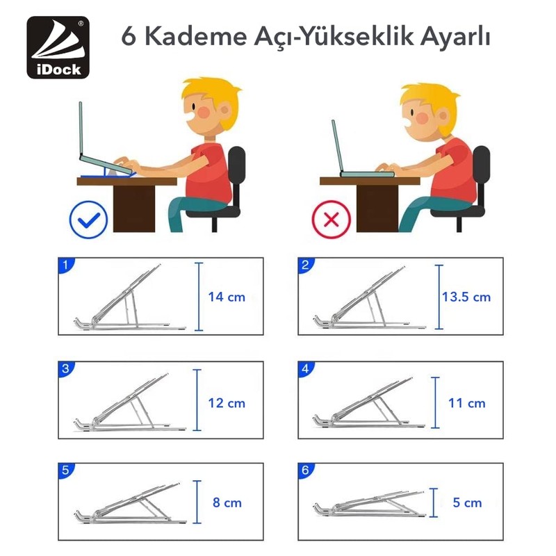 - Laptopunuz için Soğutma Sağlar: Altı açık dizüstü bilgisayar stand tasarımı ile, ısının hava ile temasını sağlar ve dizüstü bilgisayarınızın hava akışını artırır. Katlanabilir tasarıma sahiptir, kolayca katlanabilir ve dizüstü bilgisayar çantanıza veya herhangi bir sırt çantasına yerleştirilebilir.