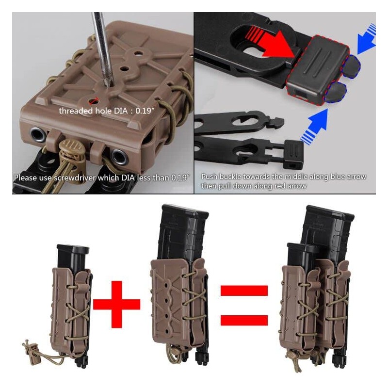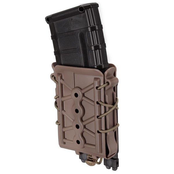 • 1.THOUGHTFUL DESIGN & SIMPLE TO USE:Reduces reload cycle time, slight twist draws magazine out easily for quick reload. Features grommet on bottom for drainage. Pop lock configuration orients excess shock cord down and out of the way. Flared tops enable easy reinsertion of magazines.Universal mounting configuration works with most mounting hardware.Shorter pouch for easier grip on inserted items and lower weight.
