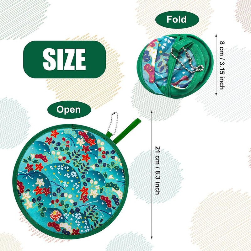 Our folding hand fans have a diameter of 21cm/8.26inch when opened, and a size of 7.8cm/3inch when closed. They are small in size and can be put into your pocket and carried with you.