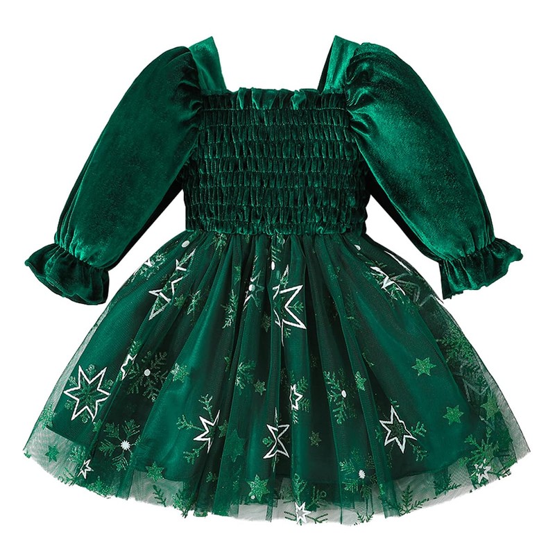 - Vintage Smocked Ruffle Velvet Tutu Dress: Toddler baby girls Christmas dress outfit snowflake smocked ruffle long sleeve velvet dress casual princess birthday party dresses clothes. Features elastic smocked shirred ruffle dress bodice, glitter stars and shiny snowflake skirt, 1920s vintage styles. Convenient pullover square neckline for easy wear, adds more cuteness. Stylish long sleeves with ruffle cuffs, fall winter long sleeve dress, pleated ruffle tutu skirt, flare a-line tunic dress