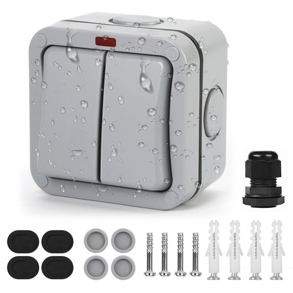 Idota Light Switch Outdoor Weatherproof Switch Universal Switch 20A IP66 Double Switch with Dust Independent Switch and Indicator Light Switch Surface-Mounted for Outdoor Garden Balcony