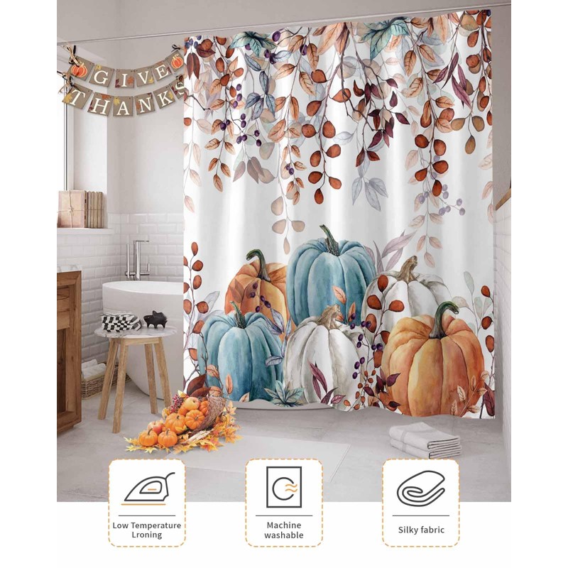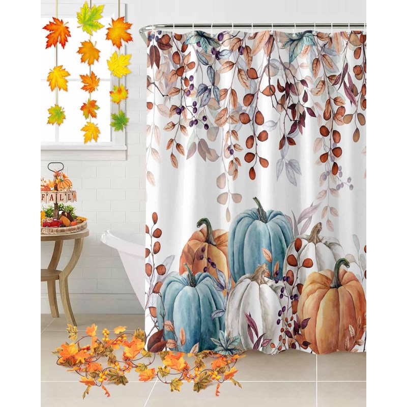 IDOWMAT Shower Curtain - Waterproof Polyester Fabric Shower Curtain Set with Hooks - Thanksgiving Fall Watercolor Eucalyptus Leaf Pumpkin Shower Curtains for Bathroom Showers Stalls Bathtubs 60"x72"